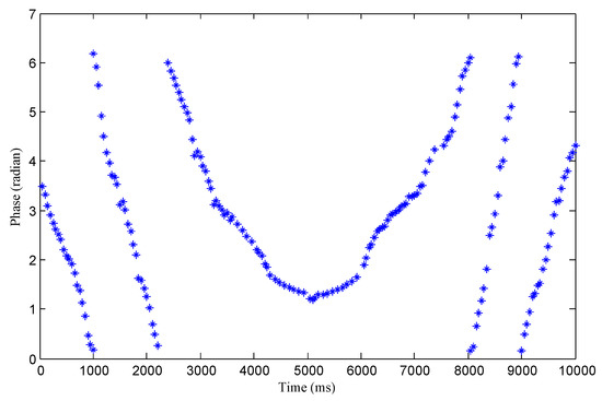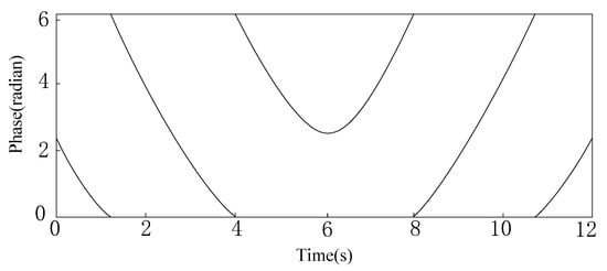 Sudden jumps between the adjacent phase curves causes discontinuity. Therefore, before positioning, we need to process the transition between the curves, that is, remove the periodicity of the phase profile. We can then perform period compensation for the jump of the phase curve. Firstly, we acquire all phase values by time; then, we compare the adjacent stages of the curve in turn, calling these two adjacent phases and . If , then it shows that there is a jump from near 0 to near 2 between these two adjacent phases. Therefore, all follow-up phases are () minus 2. In contrast, if , then it shows that there is a jump from near 2 to near 0 between these two adjacent phases. Therefore, all follow-up phases are () plus 2. This process is repeated over the entire phase profile we measured until the phase values of the last two adjacent moments are compared.