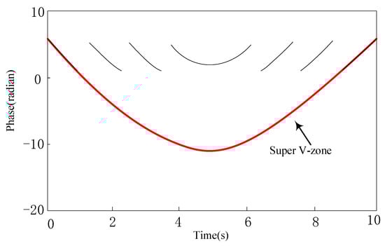 Take Figure 6 as an example, from the first curve to the second, there is a jump from 0 to 2, then for all the curves except the first minus 2, so the second curve will subtract 2 because one 0–2 jump occurs in front, the third curve will subtract 2 × 2 because two 0–2 jumps occur in front, and the fourth curve will subtract 3 × 2 because three 0–2 jumps occur in front. After that, there will be jumps from 2 to 0, and every time it appears, all following phases plus 2, and finally the super V region shown by the red curve in Figure 6 will be obtained. After the period compensation, all the phase curves are connected into a line, thus we eliminate the negative impact of the discontinuity of the phase curve on our positioning. Finally, after phase compensation, we get a super phase profile, as shown in Figure 6.