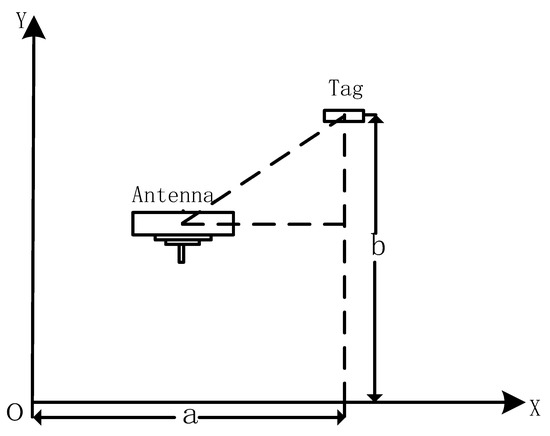 When the reader scans for chemicals, we set the starting point of each row of shelves as the origin of the coordinates, and establish a coordinate system in the plane parallel to the shelf. The moving speed of the antenna along the X axis is . Assuming that the height between the shelf layer and the layer is h, each time the antenna raises one level along the y axis, the height of the antenna is increased by h, and the robot can record the number n of layers raised by the antenna. As shown in Figure 7, if the coordinate of a certain tag is , the position of the antenna at time t is , so the distance d between the tag and the antenna at time t is:
