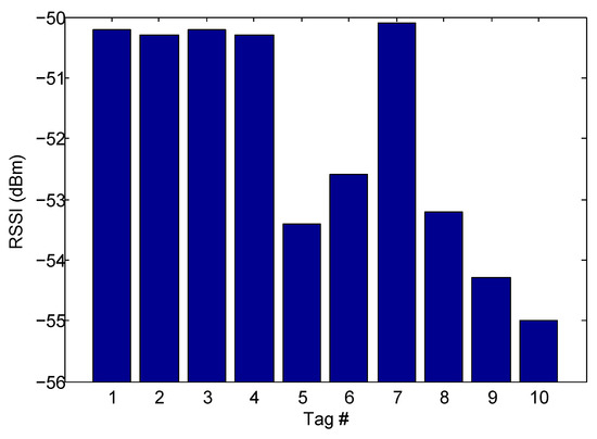 where is the power of the received backscattered signal, is the transmitting power of the reader, is the loss in the backscatter transmission, the distance between the reader antenna and the tag antenna is d, is the gains of the reader antenna and is the gains of the tag antenna. Thus, RSSI can be defined as: