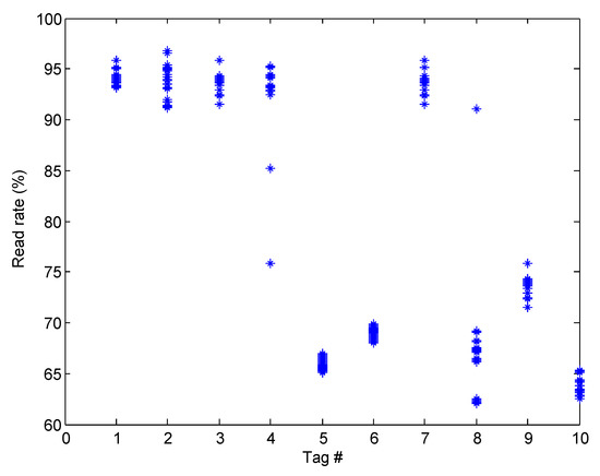 Take the first floor of the first shelf as an example, the liquid level of the chemical in the #1, #2, #3, #4, #7 bottles is less than 1 cm, and the remaining amount of chemicals in other bottles is sufficient. First, we detect the remaining amount of chemicals. The robot moves the RFID reader and antenna to the back of the shelf for scanning. During each scan, the robot moves linearly along the X-axis with a moving speed of 0.2 m/s. We performed 20 experiments, recording the RSSI value and read rate of the tags for each scan. We analyzed the results of the first layer of the first shelf. Figure 10 shows the average RSSI for each tag of the first layer during 20 scans. Figure 11 shows the read rate for each scan. We found that in most cases, the experimental results were the same as we expected. The RSSI and read rate of the tag for the chemical with insufficient margins was higher than the tag with sufficient margin. However, there are some special cases, such as #4 and #8, where the read rate of the three scans did not meet our theoretical analysis. There are two reasons for these deviations: One is the multipath effect in our experimental environment, which made our measured RSSI less accurate; another reason is the delay caused by the C1G2 protocol, which uses the frame slot ALOHA algorithm. During the reading process, each tag randomly selects the time, and only when the tag selects a single time slot can it be successfully read; otherwise, it will reselect the time slot in the next frame. So some tags may have been successfully identified in the last few frames, which will have had a certain degree of impact on the read rate.