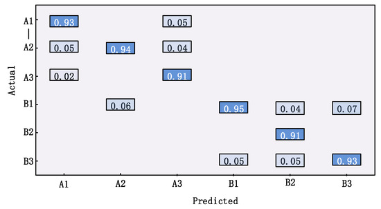 We call the two shelves A and B, and the first layer of A is A1. To illustrate the positioning accuracy of this system, we use a confusion matrix to illustrate. For the positioning result of each tag, if the predicted shelf number and floor number is not the same as the ground truth, we believe it to be wrong positioning. The confusion matrix in Figure 13 indicates that the probability of the tag being positioned on another shelf or other floors is small. For example, the probability that a tag in A1 is incorrectly located to other floors is only 9%.