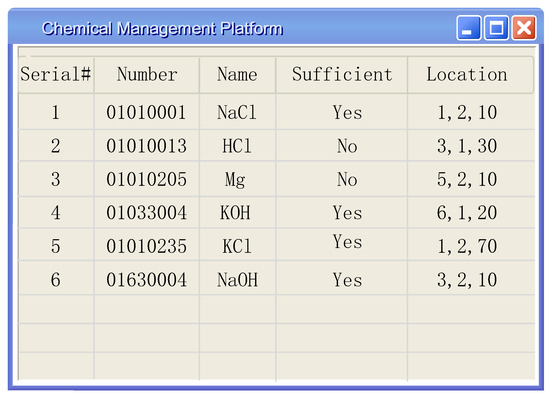 Our positioning method can provide a coarse-grained positioning accuracy for chemicals, and the accuracy we achieved was 92%. Although the positioning accuracy is not very high, this method can also reduce the search range for managers, reduce the workload and save time for them. Figure 14 shows the user interface of our system. The location information is the shelf number, the layer number, and the distance from the starting point in cm.