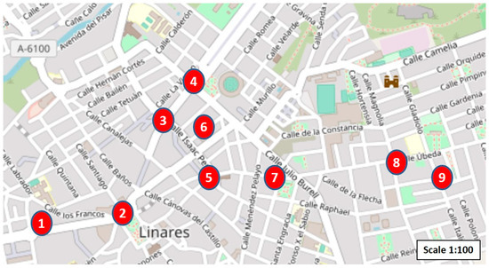 The City Council of Linares, through the area of urban planning, established those locations of the city that were considered the most critical from the point of view of noise pollution. Specifically, eight locations were established, which mostly covered the entire downtown area. To these locations, we decided to add one more, considered as noncritical. Therefore, in total, nine low-cost nodes have been installed as measuring points. Table 2 and Figure 1 show the exact locations of these points.