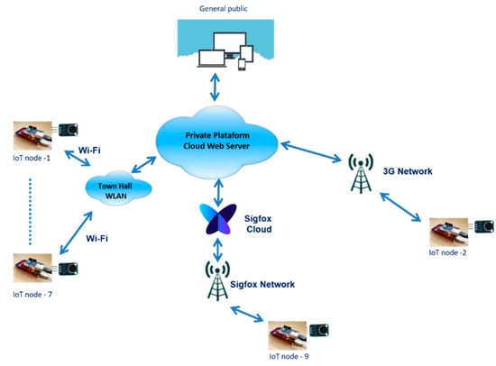 Because of the existence of the corporate Wi-Fi network that the City Council of Linares deployed in the city, as well as the absence of power supply restrictions, we proposed using this Wi-Fi network in all of the locations where this was possible. After analyzing the coverage, it was detected that, in seven of the nine locations, it was possible to use said Wi-Fi network. However, in two locations (nodes two and nine), there was no coverage. For these two locations, we decided to use 3G and Sigfox technologies, respectively. The network topology for the proposed complete system is shown in Figure 2.