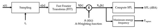 Finally, the last block computes the total energy of the weighted frequency components to obtain the sound pressure levels (SPLs) in dBA. Using the Parseval’s relation [52], the total energy of the waveform can be summed across all of its frequency components, as follows: