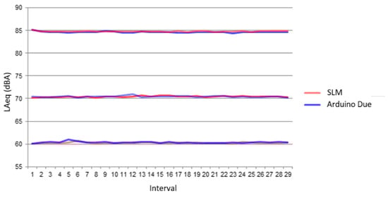 The differences between the Arduino Due and the SLM were approximately 1 dBA in the LAeq measured. The maximum difference was in the period Levening, being 2.41 dBA. This is because the dynamic range of the sensor is 44–105 dBA, and therefore, it cannot measure noise levels below 44 dBA. Alternately, the LAmax measured with the SLM was 88.1 dBA, while that with the Arduino Due was 90.5 dBA. The results of the previous tests indicate that the software designed for the Arduino Due has a good performance when we compare the differences between the acoustic measurements calculated by the Arduino and those of the commercial SLM.