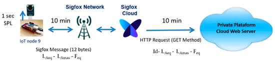 In all of the sensor nodes, in addition to the acoustic noise monitoring software, the communication software was implemented to send data to the Platform Cloud Web Server. To send the data, we decided to use the HTTP protocol. Therefore, a web client was implemented on each sensor, except for on sensor node nine. Node nine was programmed using the Sigfox API for sending data, and a callback was configured in the Sigfox backend, so that an HTTP request with the GET method was made to our cloud web server.
