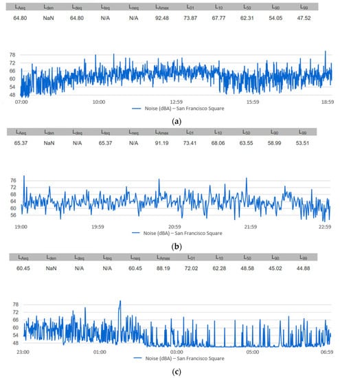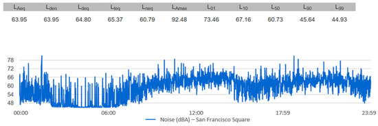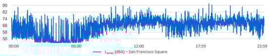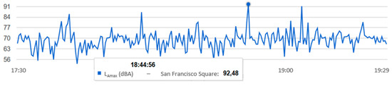 Figure A3 shows the maximum noise during 22 November 2016, for the daytime period (07:00–19:00) at Julio Burell Street. It can be seen that there is a permanent noise of approximately 92 dB from 13:00 to 15:00. At that time, the noise subsided, probably due to the break for the workers’ lunch, and the activity restarted at 16:00. We could say that the workers had an hour’s break and finished their workday at 17:30.