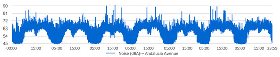 Finally, we show the measurements made by the sensor with Id eight located on Ubeda Street. As seen in Figure 10b, the sensor was located just above a terrace of a bar where people usually go to eat and drink outdoors in good weather. Figure A6 shows the temporal evolution of acoustic noise during a weekday (Wednesday, 9 November 2016) and during a weekend day (Sunday, 13 November 2016).