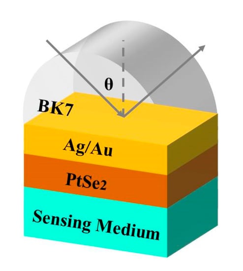 Z. Lou and other authors provided their synthesized nanoparticle−organic clusters (NOCs) as signal amplification reagents permitting an SPR signal four times higher than that of the sandwich format [36,37,38]. Here, our design presents a proposed structure having a high-sensitivity sensor separately containing PtSe2, as shown in Figure 1. In these SPR structures, the Ag or Au film is installed on top of the BK7 coupling prism, and the PtSe2 layer is the biomolecular recognition element coated on the Ag/Au film surface. The size of the thickness of the PtSe2 monolayer is 0.375 nm [27]. We have used BK7 glass as a coupling prism. As the first-rank metal for SPP, the Au film or Ag film is chosen at 50 nm. The BK7 glass refractive index can be calculated using the following equation [39]: