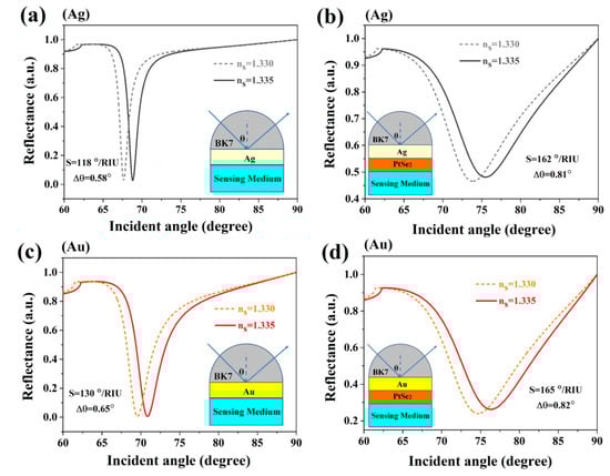 Because of the low refractive index of BK7 glass, it was chosen as the coupling prism in these expected biochemical sensors. For the conventional SPR, the Kretschmann geometry biochemical sensor mostly offers a simplex metallic layer to survey SPP, as illustrated in Figure 3. The values of the sensitivity of the conventional Ag or Au metal were 118°/RIU and 130°/RIU, as shown in Figure 3a,c, respectively, by using BK7 glass prism. However, this value is not satisfactory for biochemical sensor sensitivity [45,46]. In this paper, we have developed SPR biochemical sensors by using 2D TMDC PtSe2 materials to enhance the sensitivities of the sensors.