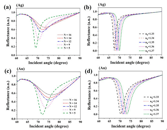 Based on these biochemical sensor results, the 2D TMDC PtSe2 material might increase sensitivities. The reflectivity of PtSe2 layers changed with the variation in the incident angle, which is shown in Figure 4a,c, illustrating that sensitivities varied with different layers of PtSe2-based biochemical sensors from ns = 1.33 to ns = 1.37 to the sensing medium refractive index. The reflectivity changes with the incident angle are shown in Figure 4b,d. It is clear from Figure 4b,d that, with the increase of refractive indices of the sensitive media, the angles of resonance of PtSe2 sensors at 2.0 nm thickness shifted to a higher angle of incidence. The resonance angles were 67.54°, 68.13°, 68.75°, 69.39°, and 70.06° when ns = 1.33, ns = 1.34, ns = 1.35, ns = 1.36, and ns = 1.37 for Ag film, respectively. Whereas, the resonance angles for Au film were 70.33°, 71.01°, 71.73°, 72.49°, and 73.28° when ns = 1.33, ns = 1.34, ns = 1.35, ns = 1.36, and ns = 1.37, respectively.