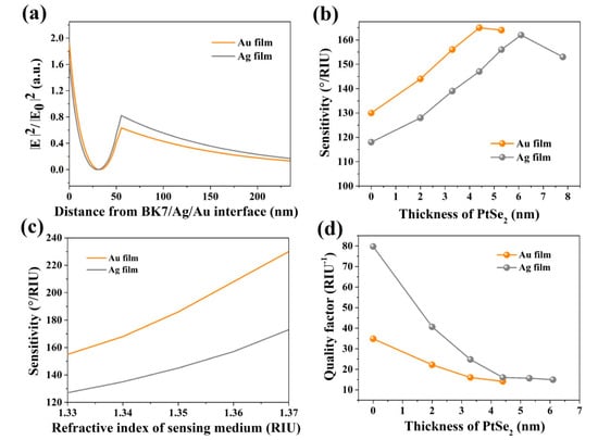 (a) Electric field distributions for the PtSe2 on Ag film and Au film sensors; (b) Variation of sensitivity with respect to PtSe2 in different thicknesses; (c) The sensitivities of the proposed biochemical sensors with 2.0 nm PtSe2 vary with the refractive indices of sensing medium on Ag film and Au film, respectively; (d) Variation of quality factors with respect to the thickness of PtSe2 varying from 0 to 7 nm of PtSe2 biosensor.