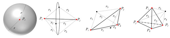 As can be seen from Figure 1, if the number of initial points is 1, the new points satisfying the distance constraint are likely to be located in any position on a sphere, where the distance between the new points and pi is r. Likewise, the new points may be a circle or two points, respectively, if the number is 2 or 3. Only when the number is 4 is the new point unique.
