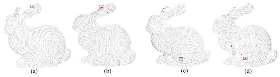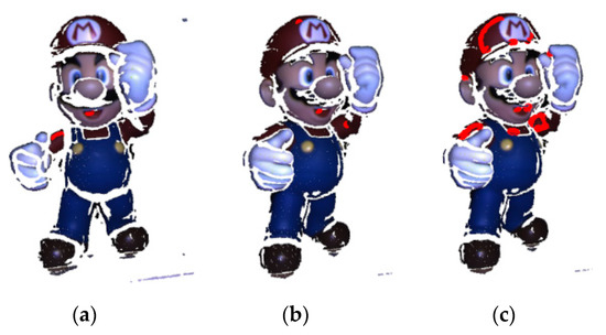 where Formulas (7) and (8) are applied to the case in which the values of color belong to the types of floating-point and RGB integers, respectively. is the color value of point qi in the source dataset, RGBj the jth color in the source dataset, σc the threshold for color tolerance, and , , and are the values of R, G, and B, respectively, of point qi. When the type of color is floating-point, the point qi belongs to the jth color if the absolute value of the difference between and RGBj is less than σc, and vice versa. Similarly, when the type of color is integer with a R, G, and B value, the point qi belongs to the jth color if all absolute values are less than σc. Figure 10 shows a comparison of the points from two datasets with the same color correspondence using color tolerance.