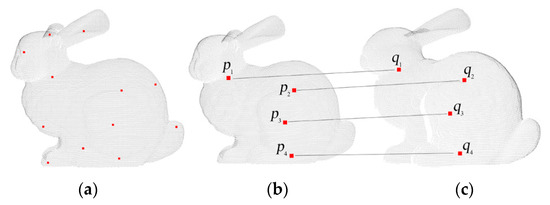 As a rule, when a 3D scanner scans the object, the instrument is perpendicular to the ground, so the z values of the same two points in both point datasets have a consistent relationship; that is, if the z value of pi is greater than pj in P, then qi must also be greater than qj in Q. The FIPP algorithm determines the four initial point pairs by traversing combinations of candidate points within the constraints of feature similarity, the same distance, and direction consistency. Figure 3 is the process of selecting four point pairs.