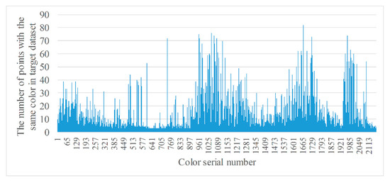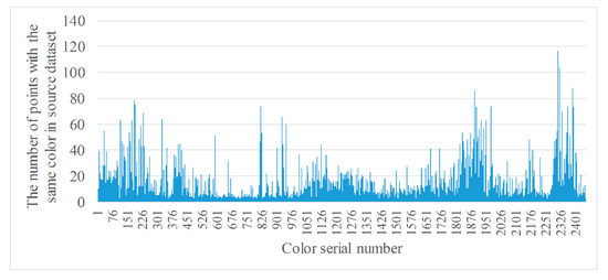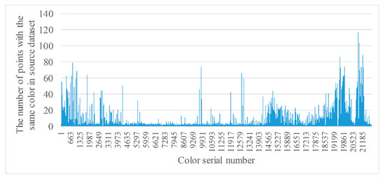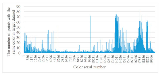 It can be seen from Figure 5 and Figure 6 that, there are approximately 20,000 colors in the target and source, datasets, respectively, and the number of points of the same color ranges from 1 to over 100. However, the number of colors is still high even though it has decreased by more than half. In addition, colors with a smaller number of points are much more numerous than those with a large number of points. Therefore, the distribution of colors should be counted in order to understand the proportion of colors with the same number of points.