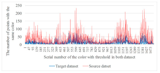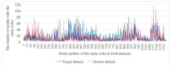In Figure 9, the blue lines indicate the number of points of the same color in the target dataset and the red lines indicate that of the source dataset. In terms of the number of colors, it is decreased by approximately half because some colors in the two datasets are not the same. In terms of the number of points of the same color, there are large differences in the same color from the two datasets. In some colors, the number of points in the target dataset is far greater than in the source dataset, while being far less in others. The reason for this is that the two datasets were acquired twice and there was a slight deviation in color between the two images.
