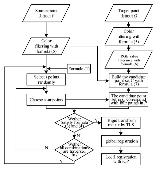 When a candidate points set with color tolerance is defined, the FIPP algorithm can be performed to look for point-to-point correspondence between two point cloud datasets. After this, a rigid transformation matrix can be obtained with point-to-point correspondence as to global registration, and then point cloud registration is accomplished by local registration. In this section, the FIPP algorithm is improved for searching strategy with RGB value, a rigid transformation matrix of global registration is calculated TLS, and local registration is calculated by the ICP algorithm. The complete 3D point cloud registration flow chart is presented in Figure 12.