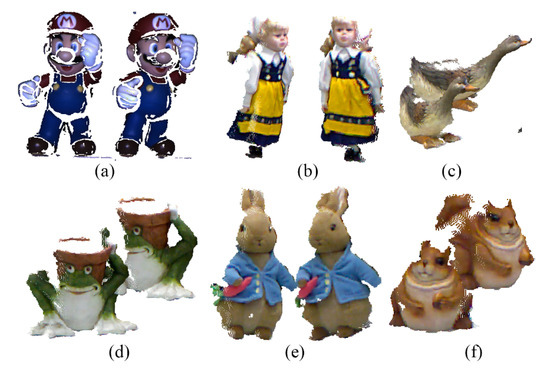 The original datasets: (a) SuperMario; (b) Doll; (c) Duck; (d) Frog; (e) Peterrabit; (f) Squirrel.