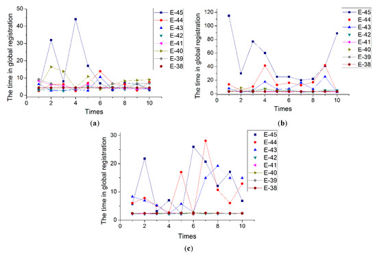 Parameter σc determines the number of candidate points with the same color. The larger the value of σc, the greater the likelihood of the same points. Nevertheless, the specific impact on global registration depends on the distinction of color. If the distinction is small, the number of candidate points with the same color is so much that can find enough point pairs to registration without a larger value of σc. In this situation, the value of σc has little effect on run time, and vice versa, that can be seen in Table 5, Table 6, Table 7 and Figure 18. Moreover, despite the influence of σc depends on the distinction of color of the point cloud, there have the same rule that stability of registration is getting higher and higher with the increase of σc. However, the increase in stability of runtime also sacrifices the accuracy. So, the choice of the value of σc should follow the principle of balance between runtime and accuracy. And here, the values are both set to E-42.