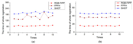 As can be seen from Table 8 and Table 9, the calculation times for three descriptors are all very stable as a whole, however, the times of calculating RGB value are much less than the other two. The runtimes of searching point-to-point correspondence using FPFH and SHOT in SuperMario datasets are very unstable, ranging from 11 to 81 s and from 8 to 31 s, respectively. In addition, the runtimes of searching point-to-point correspondence with RGB value are all far less than FPFH and SHOT, because RGB-FIPP only searches for four points pairs. It is worth mentioning that this step of RGB-FIPP is less accurate than the other two methods, but it can be compensated by the subsequent ICP algorithm. Even if the time for ICP is added, the total time by RGB is still less than the others. The average total time of the RGB-FIPP method is 15.5 s, which is better than 36.4 s of FPFH and 48.2 s of SHOT. Thus, 3D point cloud registration using the method proposed in this paper can achieve both faster speed and high accuracy.