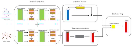 The operation reduces the dimension of S from N × N to N × 1 and obtains a single value to describe the similarity for each pseudo-cloud to template cloud. And since the pseudo-cloud is the multiple copies of each point in the search cloud X, the obtained value actually describes the similarity between a point in the search cloud X and the template cloud Z. This makes it easier to decide which point in the search point cloud is the target point we need to track. The whole process of calculating similarity is shown in Figure 4.