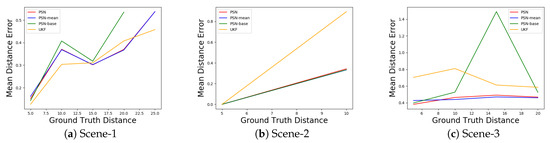 The mean error distance to the centre of the box is shown in Figure 6. In two out of three scenes, the proposed PSN methods have smaller error than UKF. Figure 6c highlights the importance of the attention module. The networks with an attention module have consistently smaller error even with large disturbances. This also proves that the attention module could filter noise. We also noticed that UKF outperforms the proposed methods in Figure 6a. We speculate that this is due to the sparsity of the input point clouds, thus the network has fewer useful features to use.