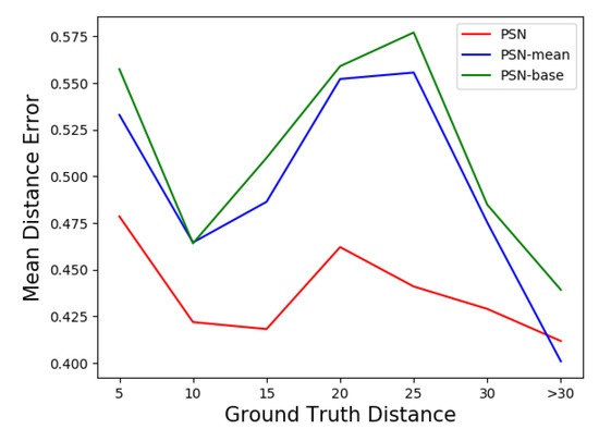 In all the three reported trackers, which do not depend on the front-end person detector, PSN achieves the highest accuracy and highest robustness similar to the result in the previous experiment, while PSN-mean is slightly inferior to PSN. This illustrates that for the tracker with attention module, the tracking performance is possible to degrade if all points are considered during the tracking. Meanwhile, it also shows that the trackers with the attention module have better performance than that without the module. The mean distance error shown in Figure 8 also illustrates the same results. They both show that the attention module could improve the performance of the method. Meanwhile, improper operation in converting similarity map may result in degeneration of the most similar point prediction.