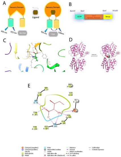 Designing of nanosensor. (A) Generic representation of the Förster/Fluorescence Resonance Energy Transfer (FRET) mechanism with sensor protein attached to Enhanced Cyan Fluorescent Protein (ECFP) and Venus. In the absence of ligands, the sensory domain exists in an open form with the inter-fluorophore distance being large enough so as to preclude any FRET (fluorescence emission only by ECFP at 475 nm). On binding with the ligand, the sensor takes on a closed form bringing the attached fluorescent proteins within FRET permissible range, resulting in fluorescence emission by Venus at 530 nm. (B) Schematic representation of the GEII sensor with LivJ as the sensory domain and ECFP/Venus as the fluorescent pair. Restriction sites are also depicted. (C) Docking pose of LivJ in complex with isoleucine. Ball and stick form represent isoleucine. (D) Pictorial representation of the open and closed forms of the LivJ binding protein in the absence, and presence of isoleucine, respectively. (E) Interactions of the active binding site in the LivJ-isoleucine bound complex as determined from docking studies carried out using Schrödinger suite.