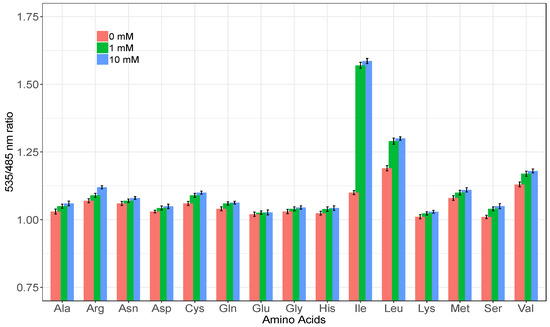 Specificity analysis of the GEII nanosensor. FRET ratio of the GEII sensor in absence and presence of 1 and 10 mM of different amino acids. All values are the mean of three independent experiments. Error bars indicate standard deviation. Excitation filter/slits (430/20 nm) and emission filters/slits for ECFP (485/20 nm) and Venus (535/25 nm) were used.