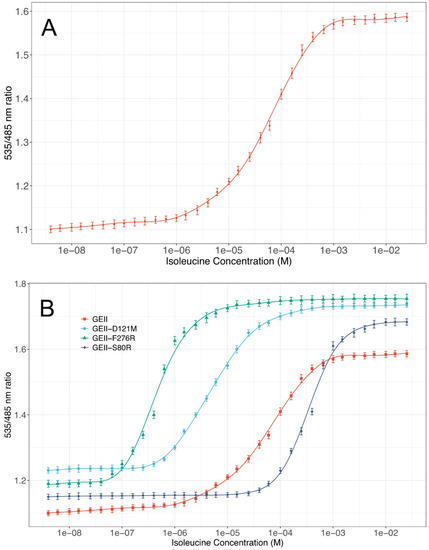 The three viable mutations were selected for experimental verification, and dissociation constants determined for each of the affinity mutants (Figure 4B). While GEII-S80R showed a reduced affinity for isoleucine vis-à-vis GEII (Kd = 411 ± 17 μM), the other two mutations resulted in sensors with improved binding affinities. The dissociation constants of GEII-F276R and GEII-D121M were determined to be 518 ± 18 nM, and 5.3 ± 0.5 μM, respectively. Considered together, GEII and its mutants have an operating range of 96 nM–1.5 mM, which makes them suitable for measuring isoleucine concentration over the entire spectrum of physiological ranges. For example, while GEII is an appropriate choice for measuring blood plasma isoleucine concentration (45 μM to 105 μM), GEII-S80R with a detection range of 73 μM–1493 μM is more suitable for monitoring isoleucine in human lymphoblasts cells (300 μM–500 μM), and TF 70 R cells (700 μM–1430 μM). Appropriate mutants should be selected based on the target isoleucine concentration. Table 1 summarizes the characteristics of the developed affinity mutants.