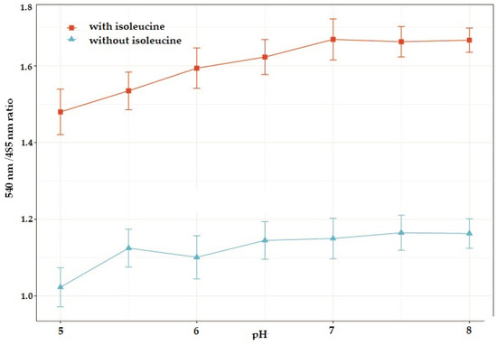 pH stability analysis of the GEII nanosensor. Measurement of the FRET ratio change of purified GEII nanosensor protein at different pH of the buffer solution in the absence, and presence of 10 mM isoleucine. Sensor protein concentration was kept at 0.20 mg/mL. All readings are averages of 3 independent experiment runs with the error bars indicating standard deviation.
