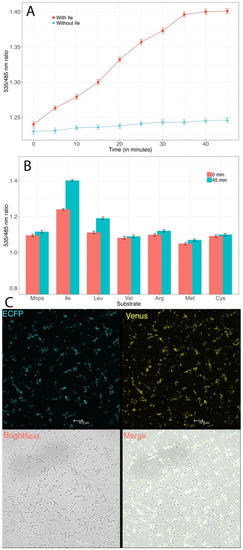 Methods, such as spectrophotometric assays [13], high performance liquid chromatography (HPLC) [14], radioisotopes [15], and mass-spectrometry [16] have been used in the past to measure isoleucine concentrations in plasma and bacterial cells. However, these techniques are highly invasive, have limited cellular resolution, and provide only a snapshot of the metabolite dynamics in cells. This prevents detailed studies to be undertaken, in order understand the isoleucine mechanism in living cells. To mitigate these limitations, a number of biosensors were developed for BCAAs. For example, Chino et al. reported a dye-based fluorescent sensor Gln149Cys-M for BCAAs [17]. Mustafi et al. developed a transcriptional regulator-based cellular biosensor for BCAAs [18]. However, both of these sensors respond to all branched-chain amino acids as a group and are only limited to in vitro/bacterial applications. Amongst sensors responding to specific BCAAs, Mohsin et al. constructed a Förster/Fluorescence Resonance Energy Transfer (FRET)-based sensor with a specific response to leucine for use in bacterial and yeast cells [19]. However, no reported instances of a biosensor exist that respond specifically to isoleucine and can be used in vivo.