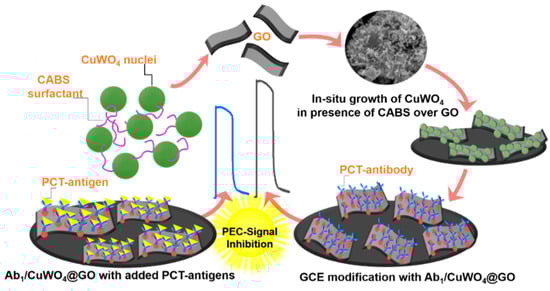 The recent up-gradation in photoelectrochemical (PEC) sensors based on their synergic combination with advanced nanomaterial has proven effective in achieving robust signal sensitivities for low-concentration clinical species. In particular, the detection of cancer biomarkers, whose precise detection at a low concentration is crucial for timely diagnosis and therapeutics [,]. Despite the rapid progress in PEC engineering, the fast charge-carrier recombination and limited immobilization area, particularly in the case of bio immunosensors, are major challenges that restrict the construction of an efficient PEC biosensor []. In this context, various combinations of materials, including metal–organic frameworks (MOFs), semiconductor/carbon composites, transition metal dichalcogenides, and their hybrids, have been proposed to advance the PEC sensors performance [,,]. Here, the use of hierarchical structures, complex morphologies of nanomaterials have shown relatively superior performance compared with their traditional counterparts. Particular, in terms of electro-catalytic activity, the complex morphologies are known to exhibit superior performances owing to the mishmash of free surface energy, the charge density concentrated at the corners of the complex morphology, and the larger total surface area [,,,,]. On the other hand, the use of heterojunction is also a promising approach to acquire a high throughput signal. However, The improved efficiencies of these heterojunctions, are often associated with procedural complexity, high fabrication cost, and biocompatibility issues, which restrict their practical use in developing a single PEC platform capable of detecting clinically-important molecules [,,].Here, the combination of highly photo-active nanostructures with a conductive substrate such as graphene, to support fast-charge transportation and greater immobilization of bio-reagents could be a viable option [,,,]. Among the many metal oxides and tungstates, copper tungstate (CuWO4) based on its suitable band-gap, high redox activity, and excellent catalytic properties is widely known for its use in photo-catalysis, water-splitting reaction, and fuel cell reactions. However, the use of CuWO4 as a photo-active transducer in PEC immunosensing still remains at an early stage []. Although CuWO4, compared with other tungsten materials, is more resilient to the photo-corrosion, and with its inherent capability to harvest visible light and chemical stability, it has the potential to be utilized as a photo-electrode. However, the relatively slow charge-carrier separation/mobility and their recombination limit the photocatalytic efficiency of CuWO4 []. In addition to high photo-activity, designing a nanoscale morphology that could support greater immobilization and maintain a good redox activity to generate a boosted signal response is yet another challenge when designing efficient PEC biosensor []. In regard to clinical biomolecules, procalcitonin (PCT) is an essential clinical biomarker primarily used for the diagnosis of bacterial infections. Rapid and selective detection of PCT from human serum samples would be beneficial for an early diagnosis, thereby decreasing the overall response time for the treatment. Contrary to the conventional approaches such as radioimmunoassay [], colorimetric immunoassay [], and enzyme-linked immunosorbent assay [], the electrochemical approach designed for the detection of such molecules offers the advantage of high sensitivity, rapid detection time, and the capability to be transformed into a miniaturized device for field portability [,]. As the concentration of PCT in normal blood is less than 0.1 ng mL−1 [], a highly sensitive electrochemical system is required for its accurate detection.