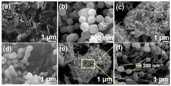 Scanning electron microscopy (SEM) images for (a) rGO flakes; (b) pristine CuWO4 nanospheres; (c–e) CuWO4@rGO hybrids; and (f) high-resolution capture of the section showing interface formation between nanospheres and rGO edges.