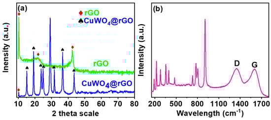 (a) X-ray powder diffraction (XRD) pattern recorded for CuWO4@rGO hybrids in reference to pristine rGO; (b) the Raman spectra of the CuWO4@rGO hybrids with prominent D and G bands typical of rGO.