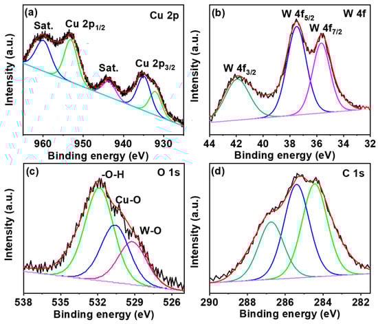 X-ray photoelectron spectroscopy (XPS) analysis of CuWO4@rGO hybrids (a) high-resolution Cu 2P; (b) W4f; (c) O1s; and (d) C1s elementals fittings.