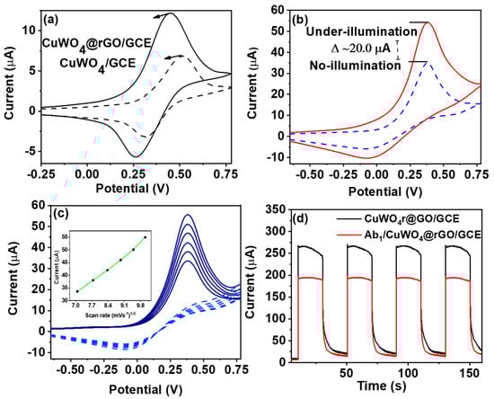(a) CV behaviour of the CuWO4@rGO in reference to pristine CuWO4; (b) electro-catalytic oxidation of ascorbic acid (AA) (0.1 mM) using CuWO4@rGO/GCE both under illumination and no illumination conditions; (c) peak current variation against scan rate in range of 50 to 100 mVs−1 with inset depicting linearity between current response and square root of scan rate; (d) photo-response of CuWO4@rGO/GCE and Ab1/CuWO4@rGO/GCE with 30 s cut-off cycle for 150 s.