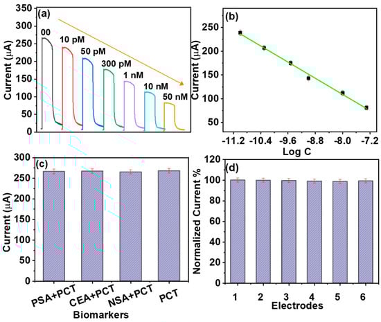 (a) Photo-current responses of Ab1/CuWO4@rGO/GCE against the different concentration of PCT in the range of 50 ng·mL−1 to 10 pg·mL−1; (b) the corresponding inhibition calibration plot; (c) the immunoreactivity of CuWO4@rGO towards PCT in the presence of different biomarkers; (d) the measured signal reproducibility for six similarly fabricated CuWO4@rGO electrodes against 10 ng·mL−1 of PCT, with 0.1 mM AA, in 0.1 M phosphate-buffered saline (PBS) electrolyte. PSA, prostate-specific antigen; CEA, carcinoembryonic antigen; NSA, neuron-specific enolase (NSA).