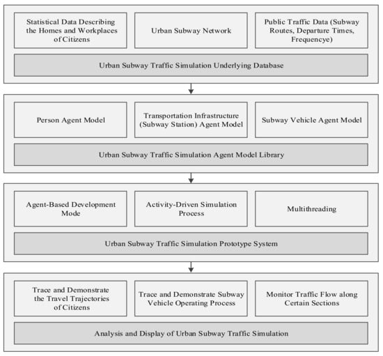 In this study, an agent-based traffic simulation framework is designed and implemented to explore the distribution characteristics of subway passenger flows during peak hours to predict recurrent congestion. In this framework, “simulation environment” refers to the subway network, and traffic entities are modeled as agents; thus, a multi-agent system (MAS) can be established. The framework takes the trips generated above as its inputs and it has a four-tier architecture, as shown in Figure 1.
