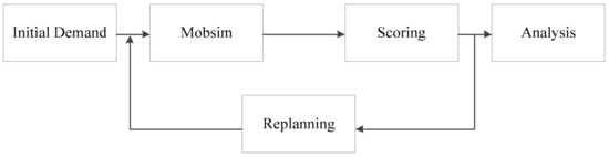 The simulation workflow used in the proposed framework is presented in Figure 2. Initial demand prepares for the simulation, including constructing the environment and creating the agents. The use of mobile simulation (Mobsim) means that all of the agents execute their actions based on designated rules and their perceptions of the environment until all of the travelers reach their destinations. Scoring evaluates the performance of a trip based on the elapsed time and travel distance. When a traveler is late, the score of the corresponding trip is far lower than those of other trips. All of the late travelers need to adjust their trips by setting out earlier in the next iteration (i.e., replanning). A relaxed state is defined as the first time when none of the travelers are late. The relevant information can then be output to permit analysis of the passenger flow characteristics.