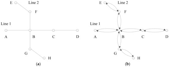 In Figure 3a, every node represents a subway station and the intersections (Node B) of edges represent transfer stations. A subway segment (or section) refers to an edge between two stations. Taken together, the stations and segments constitute the subway network. Additionally, the directed edges in Figure 3b distinguish the upward and downward flows of passengers.