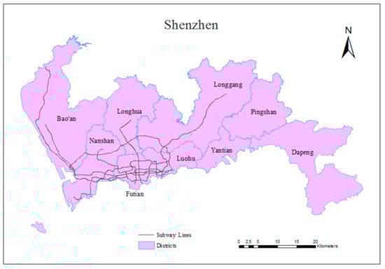 Shenzhen is used as an example in this study. Shenzhen [] is a coastal metropolis that is located in the southern part of China and adjacent to Hong Kong; it lies between the longitudes of 113°46′ and 114°37′ east and between the latitudes of 22°27′ and 22°52′ north. The total area of Shenzhen is approximately 1952.84 km2, and the population of Shenzhen is nearly 10.78 million, meaning that Shenzhen is among the most densely populated cities. Shenzhen is the first special economic zone in China and is regarded as a window on the reform and opening up; thus, it occupies a significant economic position. In addition, Shenzhen contains 10 districts that are shown in Figure 4 []. In addition, buses, subways and taxis are the main modes of public transportation in Shenzhen, and Table 1 records the passenger flow volume and annual changes for these three modes of transportation []. The subway system displays a large increase in passenger flow volume in the public transportation system of Shenzhen.