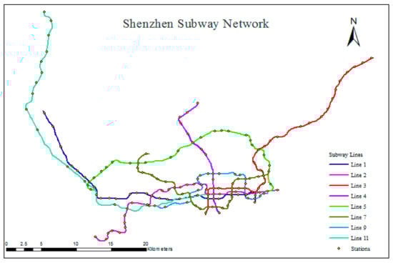 Shenzhen opened its first subway line in December 2004 and became the sixth city in China with a subway system. The system is operated by Shenzhen Metro Corporation (SZMC) and MTR <Shenzhen>. The subway system of Shenzhen presently includes eight subway lines (Nos. 1, 2, 3, 4, 5, 7, 9, and 11) and 168 stations, and the total length of the subway lines is 285 km. The subway network covers six districts, including Luohu, Futian, Nanshan, Bao’an, Longhua, and Longgang. In 2017, the daily passenger flow volume of the URT system in Shenzhen was 4.53 million person-trips and grew at a rate of 27.54%. The maximum daily passenger flow volume for the subway system of Shenzhen is 5.61 million trips. The total number of planned subway lines is 32, and the total length of these lines will be 1142 km by 2030. Undoubtedly, the subway system is receiving additional urban traffic volume in terms of both quantity and proportion, which increases the need to predict traffic congestion in this system. Table 2 provides basic information on the existing subway lines. The spatial distribution of the subway lines within the city of Shenzhen can be found in Figure 4, and Figure 5 shows this structure in greater detail, as well as the locations of the stations. Data provided by Shenzhen Research Center of Digital City Engineering.