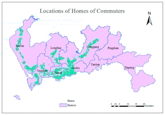 Commuting is a behavior in which people travel between their homes and workplaces and back again, and the term “subway commuters” means those who commute by subway. Because this study does not consider multimodal traffic, the target travelers exclude people who transfer between the subway and other modes of public transportation. Considering the service radius of subway stations, people whose homes and workplaces are both located within 1000 m of a station were selected for examination in this experiment. A spatial buffer analysis [] based on real road network was conducted to identify applicable experiment objects, and 833,760 individuals were selected. The distributions of the homes and workplaces of the selected citizens are shown in Figure 6 and Figure 7. These homes and workplaces constitute the OD matrix for the travels of those commuters during the morning peak hours on workdays.