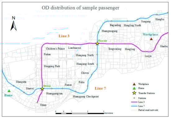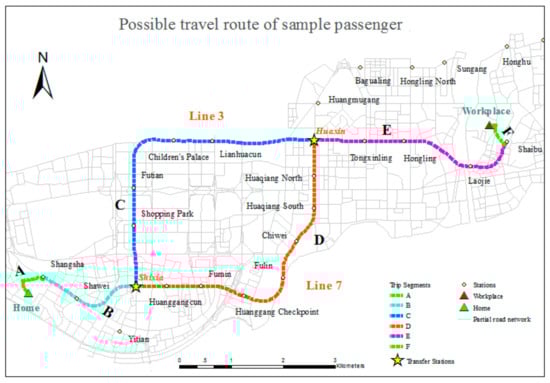 A sample traveler was presented to describe the travel plan shown in Figure 8 and Figure 9. The associated OD distribution and the related subway lines and roads are shown in Figure 8. Shixia Station and Huaxin Station are the two transfer stations for Lines 3 and 7 in the subway system. Figure 9 indicates the possible travel routes. Specifically, segments A and F represent walking trips on the road network from home to the originating station of the subway trip and from the terminal station of the subway trip to the workplace. For this traveler, Shangsha Station on Line 7 is the originating station, and Shaibu Station on Line 3 is the terminal station. Therefore, a transfer from Line 7 to Line 3 at one of the transfer stations above is necessary. Segments B and E are the parts of the subway trip that are shared between the two transfer schemes. Segment C refers to the part of the subway trip that involves transferring at Shixia Station, and segment D is selected when transferring at Huaxin Station. In general, both schemes are provided by the BMS and sorted using evaluation indexes, such as time and financial cost. The less time-consuming way is adopted in this study, and Shixia Station is chosen as the transfer station because segment D is more time-consuming, due to its longer length and the greater number of stations it passes than segment C. Therefore, the detailed travel plan for sample traveler is composed of segments A, B, C, E and F and can be written out as follows: