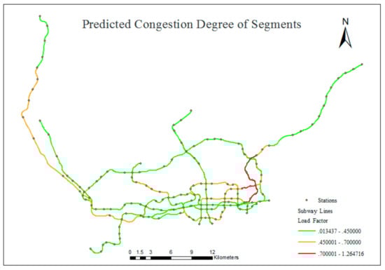 Urban traffic congestion has produced enormous challenges for both the daily lives of people and the stable development of societies and economies []. The alleviation of traffic congestion is essential and urgent. One solution involves predicting traffic congestion [,], which is a vital component of intelligent transportation systems (ITSs). Existing studies of traffic congestion prediction focus primarily on road traffic [,], and few studies have examined urban rail transit (URT) systems. Subways, which represent the main form of URT systems [], currently play an increasingly significant role in traffic systems and have become a major mode of transportation in many metropolitan areas []. Subway congestion, which usually refers to the crowding of people in carriages, causes reductions in comfort [] and increases travel time when the passengers cannot board crowded subway carriages. Such subway congestion increases delays, and the onset of an emergency situation under congestion could adversely affect evacuation [].