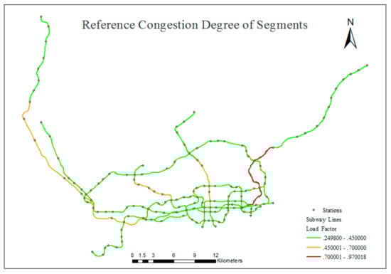 The passenger flow distribution generated from the traffic simulation results reflected the passenger flow volume in subway segments during morning peak hours, and the load factors of the subway vehicles could be calculated using Formula (5), which indicates the degree of congestion for every segment. The number of passengers selected for evaluation in the experiment was nearly 40% of the real number of daily subway passenger-trips made during the morning peak hours; therefore, μ was assigned to be 0.4. In addition, our simulation needed to fully include the peak hours in our simulation period. It takes a certain amount of time for the traveler to travel from the departure to the stop and from the stop to the work place. So according to empirical data, the simulation extended from 6:30 a.m. to 9:00 a.m.